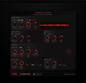 Crimson Risers is a real-time sound design synthesizer for creating dynamic, evolving audio. It targets electronic music producers, sound designers, and content creators, with a focus on aggressive risers, hard leads, cinematic tension builds, and atmospheric textures.