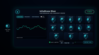InfraDrone Diver is a specialized synthesizer for deep, sub-bass textures and subterranean sound design. Built for producers and sound designers who need precise and controlled low-frequency sound sculpting.