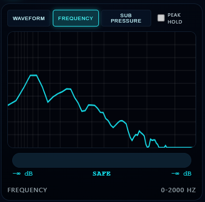 Real-time visualization includes waveform monitoring, FFT peak-hold analysis, and a scrolling spectrogram for detailed frequency observation.