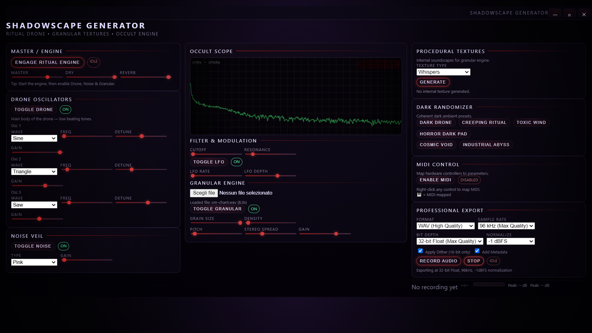 ShadowScape Generator is a standalone tool for creating evolving drones, atmospheric layers, ambient textures, and experimental soundscapes. It blends classic synthesis (oscillators, noise, filtering, reverb) with a flexible Granular Engine capable of transforming any audio file into slowly shifting, organic textures.